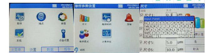 2、檢測尺寸設置:返回“設置”頁面,選擇“取樣”,選擇“尺寸”修改需要檢測的粒子尺寸,最多可同時檢測六種尺寸,每個尺寸可以在“大小”的方框中通過軟鍵盤修改,范圍需在0.3-10μm之間。設置完畢后點擊“是”。