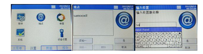1、地點設置(用來標記目前監測地點):主屏幕下方“設置”——> “地點”——> “添加...”,進入后點擊條形框出現虛擬鍵盤進行地點編輯(不支持中文輸入),編輯完畢后點擊回車鍵,點擊“是”,地點編輯完畢。
