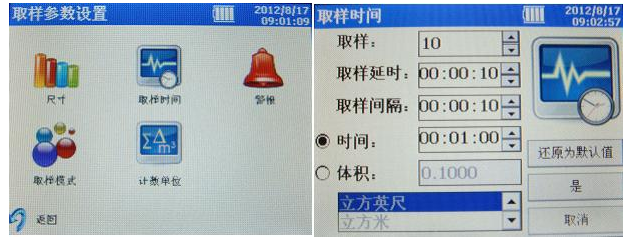 3、取樣時間設置:“設置”頁面選擇“取樣時間”,其中可以通過軟鍵盤修改取樣個數、取樣延時時間、取樣間隔時間、每次取樣時間或每次取樣體積,設置完畢后選擇“是”。
