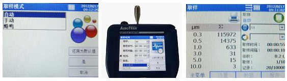 2、手動模式:“設置”頁面中選擇“取樣模式”,選擇“手動”。同樣進行取樣時間設置,手動設置中僅取樣延時時間、每次取樣時間或每次取樣體積的設置有效。返回主屏幕按啟動按鈕開始取樣,再次按啟動按鈕即停止測量。